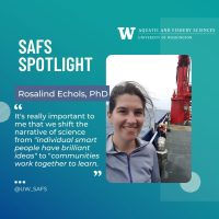 We spoke with Rosalind Echols, who gained her PhD from the School of Oceanography in Spring 2022 and is now pursuing her Postdoctoral Scholar studies at SAFS, as part of our Spotlight Series. Our Spotlight Series showcases the researchers at SAFS, how they got here, and the impact their research is having on the wider world.